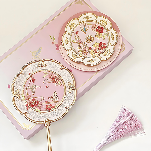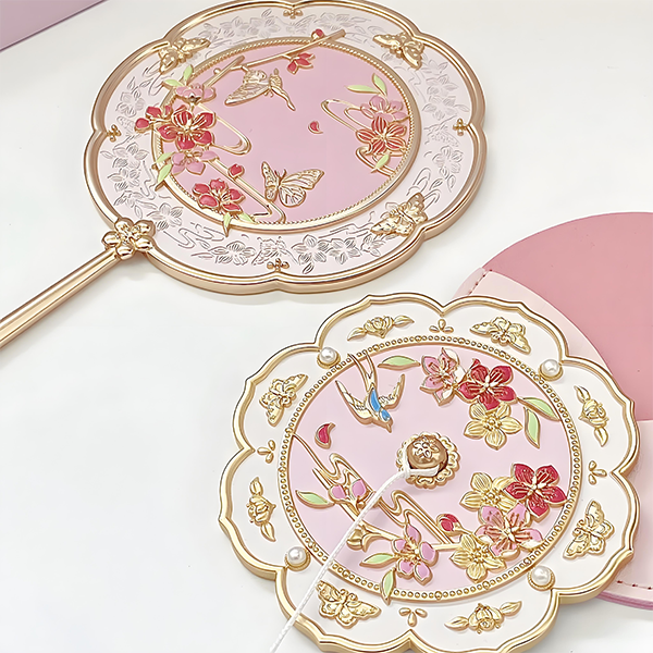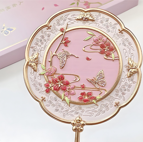Perpaduan estetika Tiongkok: Dimodelkan berdasarkan kipas kelompok Tiongkok tradisional, gaya keseluruhannya dibangun menggunakan elemen klasik. Permukaan kipas berwarna merah muda dengan motif bunga, kupu-kupu, dan burung menciptakan suasana romantis dan lembut khas Tiongkok
